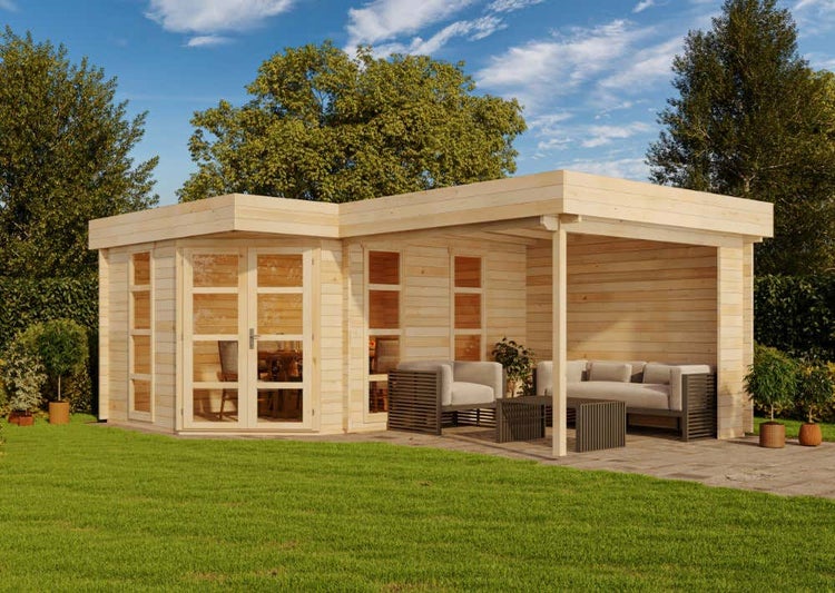 Alpholz 5-Eck Gartenhaus Lindau-40 mit Anbau aus Massiv-holz, Gerätehaus mit 40 mm Wandstärke, Garten Holzhaus inklusive Montagematerial, Geräteschuppen Größe: 442 x 618 cm, Flachdach