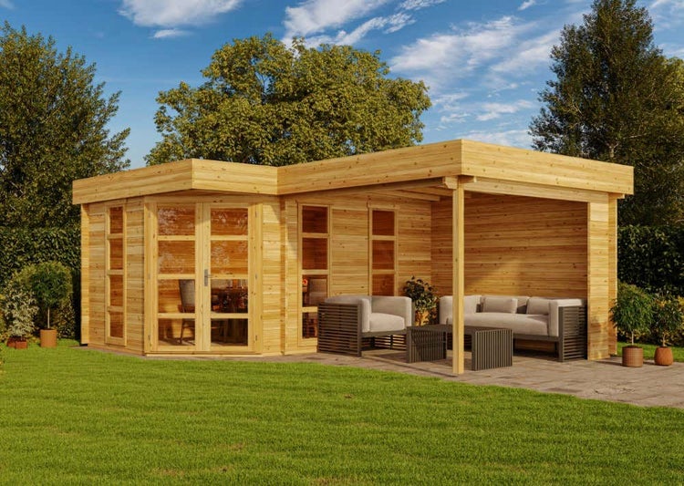 Alpholz 5-Eck Gartenhaus Lindau-40 mit Anbau Gartenhaus aus Holz in natur, Holzhaus mit 40 mm Wandstärke inklusive Terrasse, Blockbohlenhaus mit Montagematerial imprägniert 4,6x6,2m