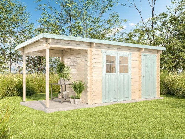 Alpholz Gartenhaus Korfu mit Anbau und Schleppdach Gartenhaus aus Holz in natur, Holzhaus mit 28 mm Wandstärke inklusive Schleppdach, Blockbohlenhaus mit Montagematerial imprägniert 5,6x2,3m
