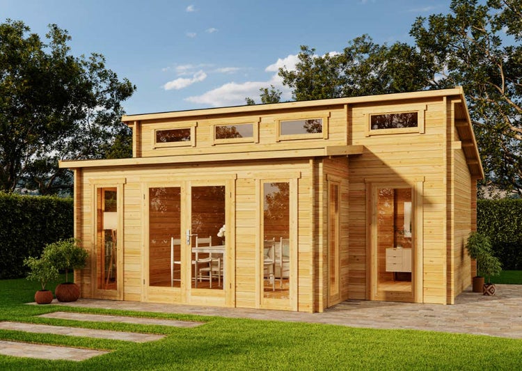 Das 5-Eck Gartenhaus Lausitz gehört zu unseren beliebtesten Gartenhäusern. Dessen Besonderheit ist das Doppel-Pultdach, das dem Haus eine moderne Form mit klarer Führung gibt. Im Innenraum entsteht so eine angenehm hohe Decke und die Oberlicht-Fenster lassen eine Extraportion Licht ins Gartenhaus.