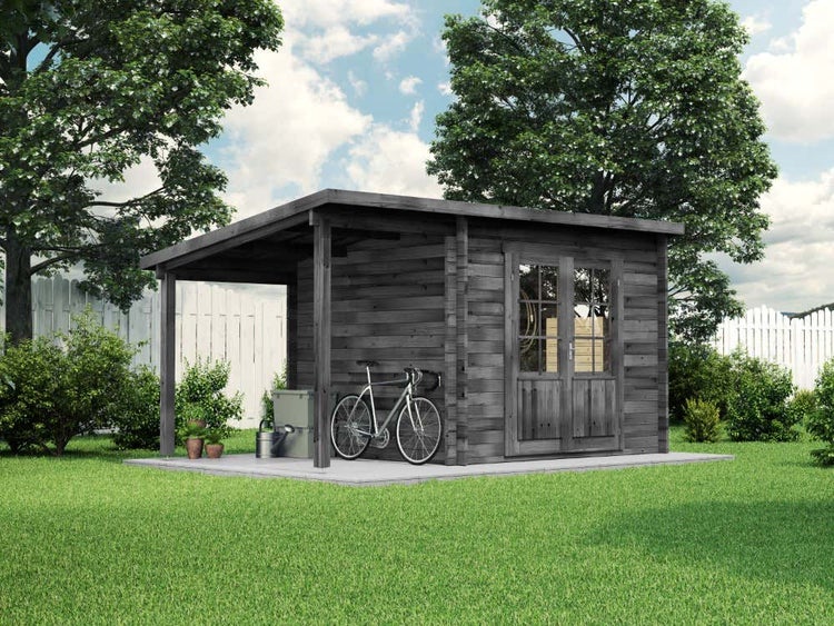 Alpholz Gartenhaus Maria mit Schleppdach aus Holz 450 x 272 cm mit 28 mm Wandstärke und Imprägnierung Grau