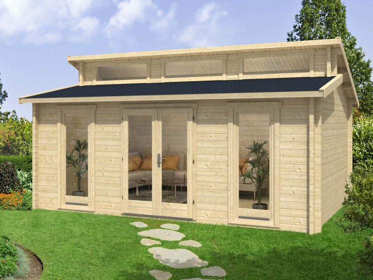 Das moderne Pultdach unseres Gartenhaus Narvig macht es zum echten Blickfang in jedem Garten. Neben den bodentiefen Fenstern wird das Haus auch von drei großen Oberlichtfenstern mit Tageslicht geflutet, was eine wohlige Atmosphäre erzeugt. Da Sie dank der Wandstärke von 70mm das Haus ganzjährig nutzen können, können Sie es sich dort auch problemlos im Winter gemütlich machen.