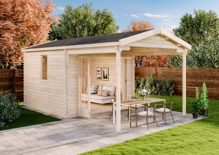 Alpholz Terrassen-Gartenhaus mit Falttür und 44 mm Wandstärke sowie Satteldach