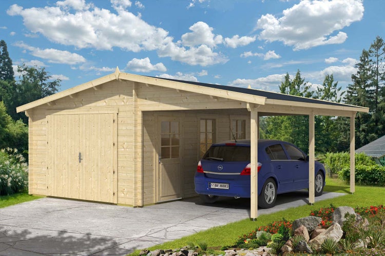 Alpholz Holzgarage mit Carport 44 ISO Garage aus Holz, Unterstellplatz mit 44 mm Wandstärke, Fertiggarage mit Montagematerial, Naturbelassen 6,7x5,3m