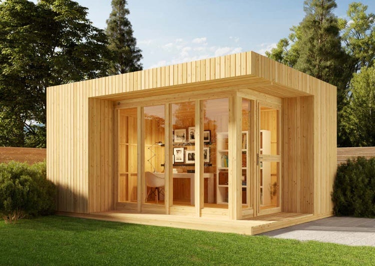 Büro für den Außenbereich Home-Office Nr. 2 aus komplett ab Werk zusammengestellten Wand-Elementen. Inklusive 19 mm Boden und 12 mm Dachverkleidung im Innenraum. Massivholzdach aus 19 mm Nut- und Federbrettern mit verzinktem Dachabschlussprofilen.