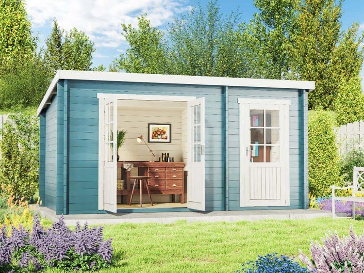 Das Pultdach Gartenhaus Maria mit Anbau der Marke Alpholz gehört zu unseren Topsellern. Dank der asymetrischen Aufteilung ergeben sich besonders viele Nutzungsmöglichkeiten: z.B. Home Office und Schuppen oder Gartenlaube und Abstellraum.