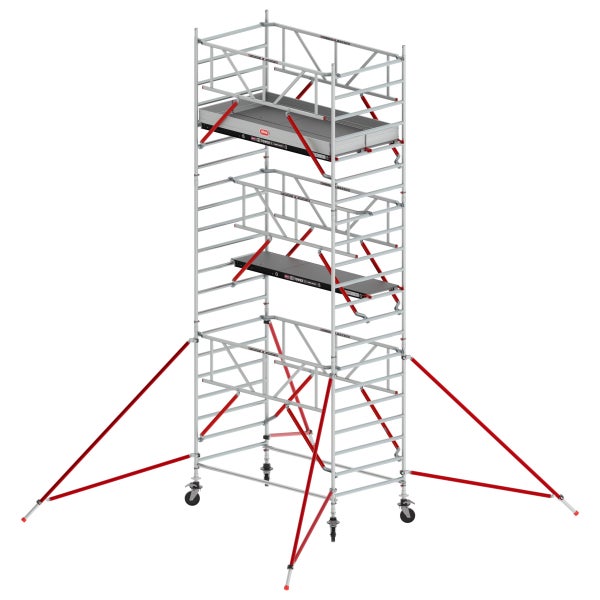 RS TOWER 52-S Fahrgerüst breit mit Safe-Quick - Das System mit zahlreichen Anwendungsmöglichkeiten. Das RS TOWER 52 ist ein Fahrgerüst, worauf man bauen kann, sowohl im Innen- als auch im Außenbereich. Das System kann mit allen Komponenten der RS TOWER 5-Serie erweitert werden. Außerdem kann das Gerüst mit anderen Anwendungen wie beispielsweise einem Laufsteg oder einer Verbreiterungskonsole verbunden werden. Damit ist Ihr Gerüst nicht nur stabil und sicher, sondern auch sehr flexibel. Mit dem RS TOWER 52 kreieren Sie Ihr individuelles Gerüst. Und das sogar bis zu einer Höhe von 14,2 m im Freien und bis zu 10,2 m im Innenbereich. Mit den breiten Aufbaurahmen von 1,35 Metern und einer Belastbarkeit bis zu 250 kg pro Plattform bietet das Gerüst Platz für zwei Personen sowie das erforderliche Werkzeug. Die Plattform ist in den folgenden Längen erhältlich: 1,85, 2,45 oder 3,05 Meter. Rundum geschweißte rutschsichere Sprossen und fest integrierte Sicherungsstifte machen den Rahmen außerdem sehr robust und 100%ig zuverlässig. Mit der optionalen Safe-Quick® GuardRail-Ausführung sind Sie rundherum geschützt und stehen Sie immer sicher. Fahrgerüst breit, große Arbeitsfläche Breite Fahrgerüste haben einen Rahmen von 1,35 Metern. Das heißt, dass zwei Plattformen nebeneinander liegen können. Dadurch erhalten Sie eine größere Arbeitsfläche. RS TOWER 52 Fahrgerüst Konfigurieren und kombinieren Konfigurieren und kombinieren Das Fahrgerüst-System kann mit Komponenten aus der RS TOWER 5-Serie erweitert werden und kann mit anderen Anwendungen wie zum Beispiel einem Laufsteg oder einer Verbreiterungskonsole kombiniert werden. RS TOWER 52 Fahrgerüst Immer sicher mit Safe-Quick® Immer sicher mit Safe-Quick® Mit der Innovation Safe-Quick® GuardRail montieren Sie schon vor dem Betreten der Plattform ein verbleibendes Geländer. Dann sind Sie rundherum auf jedem Niveau geschützt. RS TOWER 52 Fahrgerüst Starke Verbindungen Starke Verbindungen Gepresste Verbindungen zwischen Klaue und Strebenrohr machen das RS TOWER 52 so stark. Die Verbindungen sind nicht geschweißt und sind sehr strapazierfähig. RS TOWER 52 Fahrgerüst Holzplattformen oder Leichtgewicht-Plattformen Holzplattformen oder Leichtgewicht-Plattformen Das System ist mit Holzplattformen oder mit Leichtgewicht-Plattformen lieferbar. Fiber-Deck® Plattformen sind 30% leichter und sorgen für einen schnelle und einfachen Auf- und Abbau. RS TOWER 52 Fahrgerüst Integrierter Aufwähsicherung Integrierter Aufwähsicherung Mit unser innovative Plattformhaken baut man noch schneller auf und ab. Die Aufwähsicherung ist im einzigartigen Entwurf integriert. RS TOWER 52 Fahrgerüst Weiterbauen möglich Weiterbauen möglich Mit unser RS Tower 5 ist es möglich um mehrere Gerüste zu kuppeln. So wird eine Große Arbeitsbühne kreiert, ohne Höhenunterschied zwischen die Plattformen, sehr praktisch und vor allem sehr sicher. RS TOWER 52 Fahrgerüst Fest integrierte Sicherungsstifte Fest integrierte Sicherungsstifte Die Sicherungsstifte sind direkt am Rahmen befestigt. Sie befinden sich also immer an der richtigen Stelle und sind jederzeit griffbereit. Alle Bauteile können unabhängig voneinander ausgetauscht werden. Jedes Bauteil ist austauschbar Alle Bauteile können unabhängig voneinander ausgetauscht werden. Schnell bestellt, schnell geliefert und daher wieder schnell einsatzbereit. RS TOWER 52 Fahrgerüst Doppelstopp-Lenkrollen Doppelstopp-Lenkrollen Mit den Doppelstopp-Lenkrollen steht Ihr Fahrgerüst sicher und stabil an einer Stelle. Die Bremse kann leicht von Hand gelöst werden. Die Lenkrollen sind bis zu 25 cm höhenverstellbar (spindelbar). Ihr RS TOWER 52 Fahrgerüst Ihre Identität Ihr RS TOWER, Ihre Identität Kennzeichnen Sie Ihr RS TOWER mit den Farben Ihres Unternehmens. Dann sind Sie auf jedem Niveau sichtbar und erkennbar.