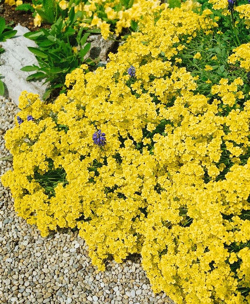 Alyssum saxatile (syn. Aurinia saxatilis) ‘Sulphureum’, das Felsen-Steinkraut oder Goldkörbchen, bringt mit schwefelgelben, dichten Blütenrispen früh im Jahr leuchtende Akzente in den Garten. Als robuste Polsterstaude entfaltet sie von März bis Mai eine üppige Frühlingsblüte, die sich wie ein Teppich über das silbrig-graugrüne, wintergrüne Laub legt. Der Wuchs ist kissenartig, kompakt und leicht überhängend, ideal für Mauerkronen, Trockenmauern und Einfassungen, wo die Blütenkissen dekorativ über Kanten fallen. Mit einer Höhe von etwa 15 bis 25 cm und guter Breite eignet sich ‘Sulphureum’ hervorragend als niedriger Bodendecker, für den Beetvordergrund im Staudenbeet, den Steingarten und den sonnigen Vorgarten, aber auch als pflegeleichte Kübelpflanze in Töpfen, Schalen und Trögen auf Terrasse und Balkon. Am besten gedeiht das Felsen-Steinkraut in voller Sonne auf durchlässigen, sandig-kiesigen, gerne kalkhaltigen und eher mageren Böden; Staunässe wird schlecht vertragen. Ein Rückschnitt direkt nach der Blüte fördert die Vitalität, hält die Polster kompakt und kann eine lockere Nachblüte anregen. Die genügsame, trockenheitsverträgliche Staude harmoniert in Gruppenpflanzungen mit Blaukissen, Phlox subulata, Iberis und Zwiebelblumen wie Tulpen oder Muscari und setzt als niedriger Solitär auf Mauerfugen markante Farbflecken. So verbindet ‘Sulphureum’ frischen Frühlingsglanz mit dauerhaft strukturierendem, wintergrünem Laub und bereichert jeden Steingarten und Beetvordergrund als langlebiger, unkomplizierter Blütenpolsterer.