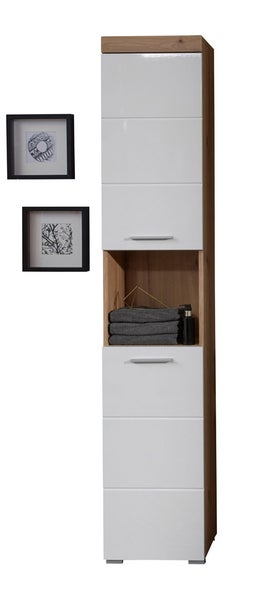 AmandaMando Bad Hochschrank 2 Türen, 1 offenes Fach Eiche Dekor, weiß Hochglanz. 37 X 31 X 190 cm