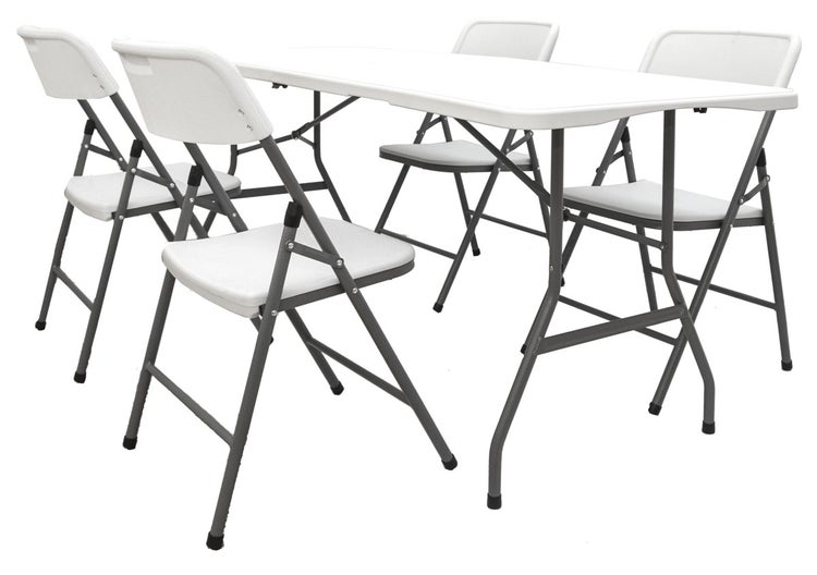 - ArtikelvorteilGARTENMÖBEL SET FÜR 4 PERSONEN - Weiße Essgruppe aus Kunststoff, 5-teilig: Edle Alternative zur Biertischgarnitur - und viel pflegeleichter als Holz. Der klappbare Esstisch ist ca. 180 x 70 x 74,5 cm groß.