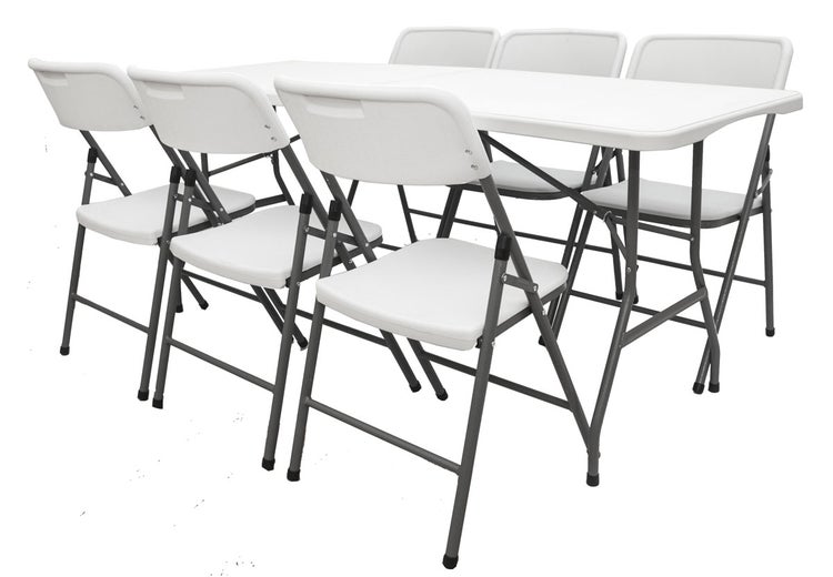 - ArtikelvorteilGARTENMÖBEL SET FÜR 6 PERSONEN - Weiße Essgruppe aus Kunststoff, 7-teilig: Edle Alternative zur Biertischgarnitur - und viel pflegeleichter als Holz. Der klappbare Esstisch ist ca. 180 x 70 x 74,5 cm groß.