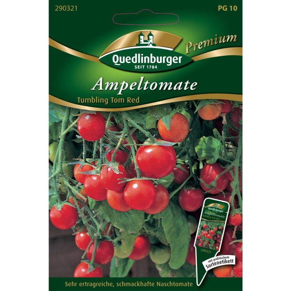 Info: Tumbling Tom Red ist besonders für die Pflanzung in Ampeltöpfen geeignet, da sie überhängend buschig wächst (kurze Internodien), sich gut verzweigt und zahlreiche, saftige, leuchtendrote Früchte trägt. 2 - 3 Tomatenpflanzen sollten in einen Ampeltopf (25 cm) gepflanzt werden. Man kann Tumbling Tom Red auch in andere Gefäße, wie Balkonkästen und Kübel pflanzen, aber ebenso an Hochbeetränder. Pflege: Ausgesät wird im Warmen (Gewächshaus/ Fensterbank), ca. 0,5 - 1 cm tief. Wenn die Jungpflanzen 4 Blätter haben in Töpfe Vorkultur: Ab Februar - MärzFreiland: Ab Ende Mai.Keimung:Bei 18 - 22 °Cin 8 - 14 Tagen.Standort:Sonnig.Ernte:Juli bis Oktober.