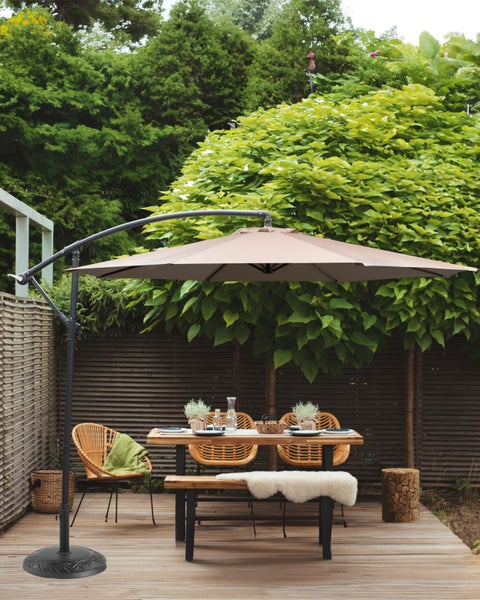 Moderner, achteckiger Sonnenschirm in Beige. Der hochwertige Sonnenschirm in der Farbe Sandbeige ist leicht in der Handhabung und lässt sich mit einem praktischen Kurbelmechanismus schnell öffnen und schließen. Die strapazierfähige, UV-beständige Bespannung ist aus robustem, schmutzabweisendem Polyester gefertigt und bietet Schutz gegen Sonnenstrahlen und Wind. Der Schirmmast aus anthrazitgrauem Stahl und eine solide Windhaube sorgen für die nötige Stabilität. Zudem lässt sich der Arm platzsparend Einziehen. Details: Typ Ampelschirm. Farbe: Beige. Farbton: Sandbeige. Material: Metall. Material: Polyester. Zusätzliches Material: Stahl. Zusammenstellung: 100% Polyester. Form: Achteckig. 360° drehbar: Nein. Volant: Nein. LED: Nein. Strebenanzahl: 8. Sonnenschirmspeichen: 8. Wippmechanismus: Nein. Öffnungsmechanismus: Kurbel. Abmessungen: Tiefe: 300 cm. Breite: 300 cm. Mast-Durchmesser: 48. Höhe: 240 cm. Gewicht: 12 kg. .Sie kaufen: 1x Sonnenschirm, Nicht im Lieferumfang enthalten: Beschwerungsplatte. Produktvorteile: Leichter Kurbelmechanismus, Mehrstufig neigbares Schirmdach bis 360 Grad schwenkbar, Sonnenschirmständer Kreuzfuß mit dem Platz für Beschwerungselemente, Schnelle und leichte Montage, Stabile und solide Konstruktion, UV-Beständigkeit, UPF 30+ (blockiert bis zu 96,7% der schädlichen UV-Strahlung). Montage: Teilweise montiert.5 - 15 Min. Zusatzinformationen: Die empfohlene Beschwerung des Schirms beträgt 50 Kg. Die Sonnenschirme sind für eine Windstärke bis zu 25 km/h konzipiert. Drehen Sie die Kurbel nach dem vollständigen Schließen oder Öffnen des Schirms nicht weiter in die gleiche Richtung, da dies den Mechanismus beschädigen kann. Beständigkeit: Windbeständig, UV-beständig. Beständigkeit Text: Dieses Produkt besitzt eine hohe Windbeständigkeit, weshalb es nicht umkippen oder seine Stabilität aufgrund von Windböen verlieren sollte. Dieser Artikel ist aus solchen Stoffen gefertigt, die im Vergleich zu Standardgeweben über eine stärkere UV-Beständigkeit verfügen und somit eine höhere Farbbeständigkeit aufweisen. Trotzdem sollte man das Produkt bei Nichtgebrauch abgedeckt aufbewahren, um seine Lebensdauer zu verlängern. Pflegeanleitung: Polyester: 1.Flecken können mit einem Polsterreiniger, einem angefeuchteten Schwamm oder milden Reinigungsmitteln entfernt werden. 2.Oberflächen nur mit geeignetem Aufsatz vorsichtig absaugen. 3.Wenn die Textilien nicht verwendet werden, sollten sie an einem sauberen und trockenen Ort vor ungünstigen Witterungseinflüssen geschützt werden. Stahl: 1.Um die Haltbarkeit Ihrer Gartenmöbel zu verlängern, sollten sie stets vor Feuchtigkeit geschützt und regelmäßig gereinigt werden. 2.Die Reinigung kann mit handelsüblicher milder Seifenlauge erfolgen. 3.Um den Korrosionsschutz des Metalls zu gewährleisten, vermeiden Sie den Kontakt mit säurehaltigen Reinigungsmitteln oder Mitteln mit basischen Komponenten. 4.Wenn das Möbelstück nicht verwendet wird, sollte es im Innenbereich gelagert oder mit einer Schutzhülle abgedeckt werden. Dies ist nicht erforderlich, wenn das Möbelstück aus verzinktem Stahl besteht. 5.Falls vorhanden, Schutzkappen in regelmässigen Abständen lösen, etwaige rostigen Ausflüsse austreten lassen, die unbehandelte Innenseite der Gartenmöbel gründlich austrocknen lassen und ev. Korrosionsschutz-Spray verwenden. 6.Jegliche Schäden an der Außenfarbe sollten vor Feuchtigkeit geschützt werden. 7.Bitte beachten Sie, dass dieses Möbelstück nicht mit Wasser in Kontakt kommen sollte, da dadurch rostiges Wasser aus dem Inneren der Rohrrahmen austreten könnte. Diese Hinweise gelten jedoch nicht für Möbel aus verzinktem Stahl, die durch den Verzinkungsprozess eine erhöhte Korrosionsbeständigkeit aufweisen.