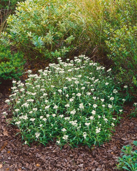Anaphalis alpicola, das Alpen-Perlkörbchen, ist eine charmante Zier- und Gartenstaude, die mit ihren elfenbeinweißen, papierartigen Blütenköpfchen den charakteristischen, edelweißartigen Reiz in Beete und Steingärten bringt. Die robusten Blüten stehen von Juli bis September über silbrig-grau behaartem, lanzettlichem Laub und verleihen der Pflanze eine attraktive, fast schimmernde Ausstrahlung. Der Wuchs ist kompakt, horst- bis leicht teppichbildend und bleibt mit etwa 15 bis 25 cm Höhe niedrig, wodurch sich diese Polsterstaude ideal für den Beetvordergrund, das Alpinum, Kies- und Trockenbeete sowie für den Steingarten eignet. Als Kübelpflanze auf Terrasse oder Balkon setzt sie dezente, elegante Akzente und harmoniert in Schalenarrangements ebenso wie in Gruppenpflanzungen; in kleinen Gefäßen kann sie auch als zarter Solitär wirken. Anaphalis alpicola bevorzugt einen vollsonnigen Standort mit gut drainiertem, sandig-kiesigem, eher magerem Boden; Staunässe sollte konsequent vermieden werden. Die Pflege ist unkompliziert: sparsam gießen, nur zurückhaltend düngen und die Triebe erst im zeitigen Frühjahr zurückschneiden, damit die filigranen Stängel den winterlichen Zieraspekt erhalten. In Kombination mit trockenheitsverträglichen Beetstauden wie Lavandula, Thymus, Salvia oder Stachys entstehen stimmige, dauerhaft gepflegte Pflanzbilder. Diese langlebige Steingartenpflanze ist winterhart, pflegeleicht und dank ihres silbrigen Laubs auch außerhalb der Blütezeit ein wertvoller Strukturgeber im Vorgarten, im Staudenbeet und in kiesigen Rabatten.