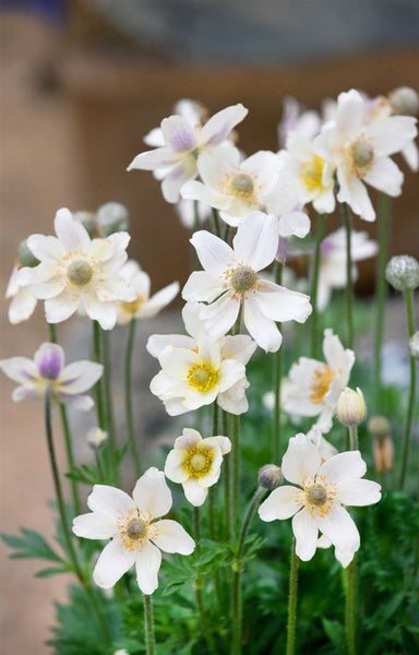 Anemone multifida ‘Annabella White’, das vielspaltige Windröschen, ist eine elegante, kompakt wachsende Gartenstaude, die mit reinweißen, schalenförmigen Blüten und goldenen Staubgefäßen begeistert. Die zart gefiederten, tief eingeschnittenen, sommergrünen Blätter bilden dichte, horstige Polster, aus denen zwischen Mai und Juli zahlreich die anmutigen Blütenstiele aufsteigen. Mit einer Höhe von etwa 20 bis 35 cm bleibt diese Blütenstaude angenehm niedrig und eignet sich ideal für den Vordergrund von Beeten und Rabatten, für den Steingarten sowie als zierliche Kübelpflanze auf Terrasse oder im Vorgarten. Als Solitär in kleinen Gruppen gepflanzt entfaltet sie eine natürliche, ruhige Wirkung und fügt sich ebenso harmonisch in Mischpflanzungen mit anderen Stauden wie zarten Gräsern und früh- bis sommerblühenden Begleitern ein.