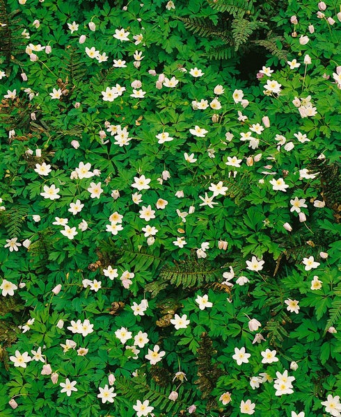 Anemone nemorosa ‘Alba Plena’, das gefüllte Buschwindröschen, ist eine elegante Frühlingsstaude, die mit ihren schneeweißen, dicht gefüllten Blüten schon früh im Jahr den Garten erhellt. Die feinen, tief gelappten Blätter bilden einen zarten Hintergrund, über dem die rosettenförmigen Blüten von März bis April leuchten. Mit einem niedrigen, teppichbildenden Wuchs und einer Höhe von etwa 10 bis 15 cm eignet sich diese Anemone ideal als Bodendecker im halbschattigen bis schattigen Bereich. Besonders schön wirkt sie in größeren Gruppen am Gehölzrand, unter Laubgehölzen und Sträuchern oder im naturnahen Beet, wo sie zwischen anderen Frühblühern harmonische Bilder schafft.