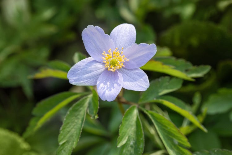 Anemone nemorosa ‘Robinsoniana’, das zart lavendelblaue Buschwindröschen, ist eine frühe Frühlingsstaude von besonderer Eleganz. Die kultivierte Form der Wald-Anemone überzeugt mit schalenförmigen, hell violettblauen bis blass fliederfarbenen Blüten, die je nach Licht silbrig schimmern und von März bis April einen bezaubernden Teppich über fein geschlitztem, frischgrünem Laub bilden. Der Wuchs bleibt niedrig und teppichbildend, dabei locker und natürlich wirkend, sodass sich diese Staude ideal zum Unterpflanzen von Ziersträuchern und Gehölzen eignet. Im Schatten- bis Halbschattenbereich, etwa am Gehölzrand, im Schattenbeet oder im naturnahen Rabattenbereich des Vorgartens, entfaltet dieses frühjahrsaktive Juwel seine ganze Wirkung. Als zarter Bodendecker in Gruppen gepflanzt oder in flachen Schalen und Kübeln auf der Terrasse sorgt es für poetische Frühlingsmomente; ebenso harmoniert es in Gruppenpflanzungen mit Farnen, Hosta, Leberblümchen oder Schneeglöckchen. Der ideale Standort ist humos, locker, gut durchlässig und gleichmäßig frisch, gerne mit Laubkompost angereichert; kurzzeitig mehr Sonne wird im zeitigen Frühjahr toleriert, solange der Boden nicht austrocknet. ‘Robinsoniana’ ist pflegeleicht und winterhart, breitet sich mit den Jahren moderat über kurze Rhizome aus und wirkt in naturnahen Beeten wie in klassischen Staudenrabatten gleichermaßen stimmig. Nach der Blüte zieht sie ein und macht Platz für sommeraktive Staudenpartner; das Laub sollte vor dem Vergilben nicht entfernt werden. Eine behutsame Teilung nach einigen Jahren kann zur Verjüngung und zur flächigen Verdichtung beitragen.