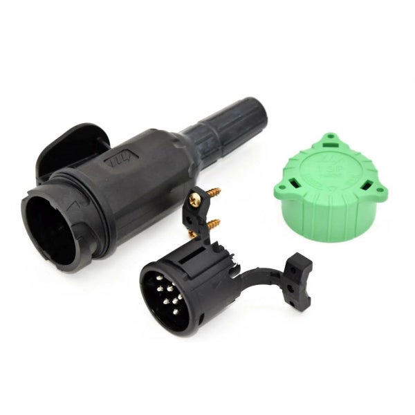 Moderner und hochwertiger Anhängerstecker aus schlagfestem Kunststoff mit spritzwassergeschützter Kabelführung, zum Anschluss eines Anhängers am KFZ mit 13-poliger Steckdose. Durch die Doppeltülle ist dieser Stecker perfekt für Kabelsätze geeignet, bei denen zwei Leitungen vom Stecker abgehen. Bei Bedarf kann die Doppeltülle einfach gekürzt werden und wird dadurch zur Einfachtülle. Die vorhandene Zugentlastung sichert die Kabelverbindung gegen mechanische Beanspruchungen. Mit der mitgelieferten grünen Kappe / Parkdose ist der Stecker bei Nichtgebrauch vor Verschmutzung geschützt und durch die Montage am Anhänger kann die Schutzkappe als Haltevorrichtung dienen.