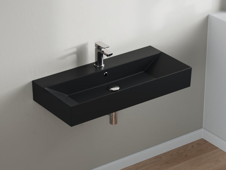 Aqua Bagno Loft Waschbecken KS.AN.90 – 90 x 42 cm – Schwarz Matt – Keramikbecken mit Hahnloch & Überlauf