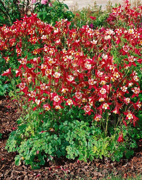 Aquilegia caerulea ‘Crimson Star’, die Garten-Akelei, beeindruckt als elegante Blütenstaude mit kontrastreicher, sternförmiger Blüte in kräftigem Karminrot und reinem Weiß. Der aufrechte, horstige Wuchs erreicht etwa 60 bis 70 cm Höhe und trägt fein gelapptes, blaugrünes Laub, das den filigranen Charakter dieser Staude unterstreicht. Von Mai bis Juni erscheinen zahlreich die zierlichen, langgespornten Blüten, die dem Beet eine romantische, zugleich klare Note verleihen und auch als Schnittblume überzeugen. Als vielseitige Gartenstaude passt ‘Crimson Star’ hervorragend in das Staudenbeet, an den Rand von Gehölzen oder in die Rabatte, wo sie mit Ziergräsern, Storchschnabel, Salvia oder Lupinen harmoniert. Ebenso lässt sie sich als Kübelpflanze auf Terrasse und Balkon kultivieren oder in kleinen Gruppen im Vorgarten als attraktiver Blickfang einsetzen; auch als Solitär im Bauerngarten wirkt sie ausdrucksstark. Bevorzugt werden sonnige bis halbschattige Standorte mit durchlässigem, humosem, frisch bis mäßig feuchtem Boden; leichte Kalktoleranz ist gegeben, Staunässe sollte vermieden werden. Ein Rückschnitt nach der Blüte fördert eine ordentliche Erscheinung, gelegentliches Ausputzen verlängert die Blühdauer, und eine dezente Selbstaussaat kann für natürliche Verjüngung sorgen. Die Staude ist winterhart, treibt im Frühjahr kräftig neu aus und zieht im Herbst ein, wodurch sie sich ideal in jahreszeitliche Pflanzkonzepte einfügt. In Gruppenpflanzung mit 3 bis 5 Exemplaren entsteht ein stimmiges Bild, das Beet- und Gartenräume wirkungsvoll strukturiert und den Blütenstrauch- und Zierstrauchpflanzungen eine feine, vertikale Note beistellt.