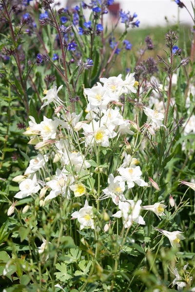 Aquilegia vulgaris, die Gemeine Akelei, präsentiert sich als romantische Gartenstaude mit filigranem Charme und eleganter Ausstrahlung. Die klassische Akelei verführt mit zart nickenden Blüten in Nuancen von Blau, Violett, Rosa bis Weiß, deren charakteristische Sporen dem Blütenbild besondere Leichtigkeit verleihen. Von Mai bis Juni setzt die mehrjährige Staude auffällige Akzente im Staudenbeet und harmoniert mit dem fein gefiederten, frisch- bis blaugrünen Laub, das den aufrechten, lockerhorstigen Wuchs schön unterstreicht. Mit einer Höhe von etwa 60 bis 80 cm eignet sich Aquilegia vulgaris ideal für den romantischen Bauerngarten, den natürlichen Vorgarten und strukturierte Rabatten, wo sie als Solitär ebenso wirkt wie in Gruppenpflanzung. Auch als Kübelpflanze auf Terrasse oder Balkon entfaltet dieser Blütenschmuck seine Wirkung, ebenso als zarte Schnittblume für die Vase.