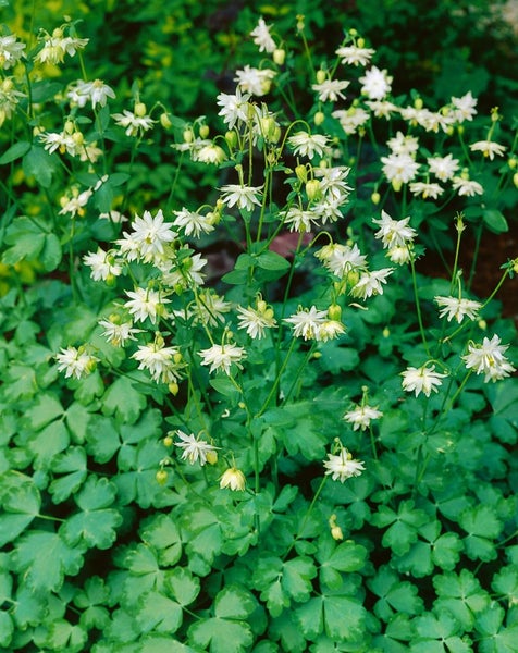 Aquilegia vulgaris ‘Green Apples’, die Gemeine Akelei ‘Green Apples’, überzeugt als besondere Blütenstaude mit aparten, gefüllten Blüten in zartem Grünweiß. Die elegante Sorte zeigt im späten Frühjahr bis in den Frühsommer hinein, meist von Mai bis Juni, pomponartige Blüten mit frischgrünen Akzenten, die über dem feinen, blaugrünen, gefiederten Laub schweben. Der Wuchs ist locker aufrecht und horstig, erreicht je nach Standort etwa 60 bis 80 cm Höhe und wirkt im Beet ebenso leicht wie romantisch. Als Gartenstaude für Bauerngarten- und Cottage-Beete setzt diese Akelei charmante Akzente in Rabatten, im Vorgarten und an halbschattigen Gehölzrändern; in Gruppenpflanzung entfaltet sie eine harmonische, natürliche Wirkung, wirkt aber auch als kleiner Solitär im Staudenbeet. In dekorativen Gefäßen lässt sie sich gut als Kübelpflanze auf Terrasse und Balkon kultivieren, wo die ungewöhnliche Blütenfarbe hervorragend zur Geltung kommt. Am besten gedeiht Aquilegia vulgaris ‘Green Apples’ an einem sonnigen bis halbschattigen Standort in humosem, frisch bis mäßig feuchtem, gut durchlässigem Boden; leichte Kalktoleranz ist gegeben, Staunässe sollte vermieden werden. Ein behutsamer Rückschnitt der abgeblühten Stiele fördert ein ordentliches Erscheinungsbild und kann die Nachblüte anregen, wer eine spontane Vermehrung vermeiden möchte, entfernt die Samenstände rechtzeitig. In Kombination mit frühen Rosen, Storchschnabel, Ziergräsern oder niedrigen Blattschmuckstauden entstehen stimmige, langlebige Pflanzbilder mit saisonaler Tiefe und edlem Farbschimmer.