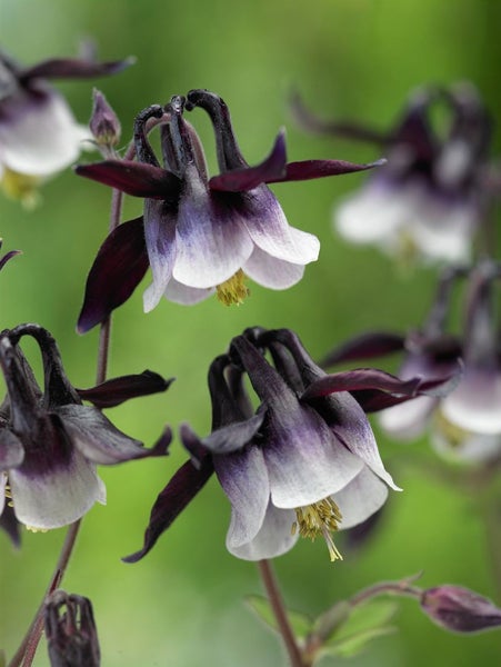 Aquilegia vulgaris ‘William Guiness’, die außergewöhnliche Akelei (Gewöhnliche Akelei), überzeugt als charakterstarke Blütenstaude mit eindrucksvoller Zweifarbigkeit: Fast schwarzpurpurne Kelchblätter treffen auf eine reinweiße, elegante Blütenmitte mit zierlichen Spornen und sorgen im späten Frühling bis frühen Sommer, meist von Mai bis Juni, für einen ausdrucksstarken Kontrast im Staudenbeet. Das zart blaugrüne, fein gefiederte Laub bildet einen attraktiven Horst, der aufrecht und locker buschig wächst, etwa 60 bis 80 cm Höhe und 30 bis 40 cm Breite erreicht und damit als Gartenstaude sowohl in der Rabatte als auch im Bauerngarten oder am Gehölzrand harmonisch wirkt. Als Blütenstaude eignet sie sich für Gruppenpflanzungen ebenso wie als Solitär in kleinen Beeten, im Vorgarten oder als saisonal wirkungsvolle Kübelpflanze auf Terrasse und Balkon; zugleich ist sie eine ausgezeichnete Schnittblume für die Vase. Bevorzugt wird ein sonniger bis halbschattiger Standort mit frischem, humosem, gut durchlässigem und gern leicht kalkhaltigem Boden; Staunässe ist zu vermeiden. Eine gleichmäßige, maßvolle Wasserversorgung und eine leichte Startdüngung im Frühjahr fördern einen vitalen Wuchs. Nach der Blüte lohnt ein Rückschnitt für kompakten Neuaustrieb; das Ausputzen kann die Blühdauer verlängern. ‘William Guiness’ versamt sich standorttreu, wodurch sich natürliche, charmante Bestände im Ziergarten entwickeln. Hübsche Partner sind Storchschnabel, Allium, Bart-Iris, Ziergräser, Farne und Hosta, die die dunkle, edle Blütenfarbe der Akelei effektvoll unterstreichen.