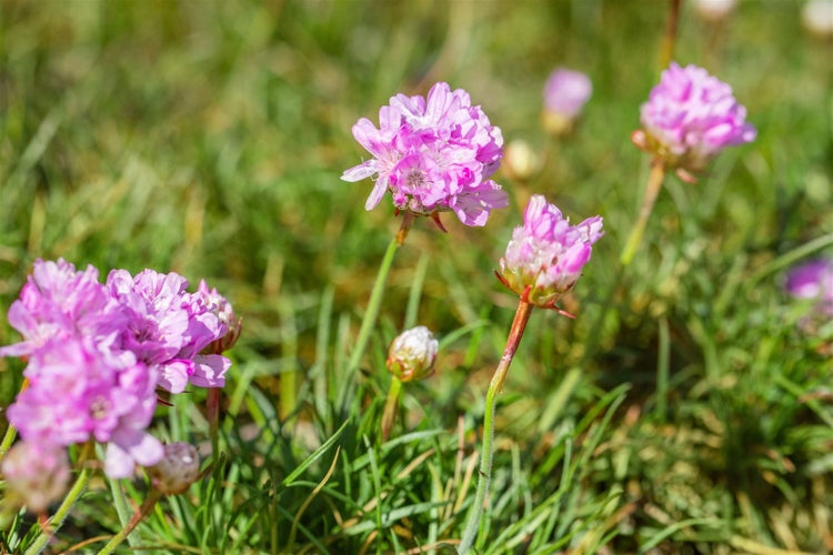 Armeria juniperifolia ‘Röschen’, die nadellaubige Grasnelke, ist eine besonders kompakte Polsterstaude mit botanischem Charme und viel Zierwert. Ihre dicht verzweigten, immergrünen Rosetten tragen feine, nadelartige Blätter, die ganzjährig ein sattgrünes, kissenförmiges Polster bilden. Von April bis Juni erhebt sich über dem Laub ein Reigen zarter Stiele mit kugeligen, rosaroten Blütenköpfchen, die wie kleine Röschen wirken; bei regelmäßigem Ausputzen folgen oft Nachblüten bis in den Spätsommer. Die Wuchsform bleibt niedrig und polsterbildend, ideal für den Vordergrund im Beet, als Einfassung am Beetrand oder als dichtes Zierkissen im Steingarten und Alpinum.