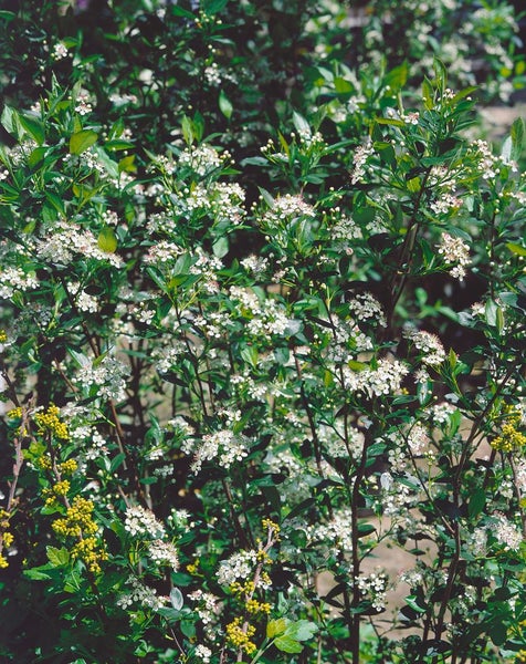 Aronia melanocarpa ‘Hugin’, die Schwarze Apfelbeere, ist ein kompakter, dicht verzweigter Zierstrauch, der mit natürlicher Eleganz jeden Garten bereichert. Im Frühjahr erscheinen zahlreiche weiße, zart duftende Blütendolden, die den Blütenstrauch in ein helles Kleid tauchen. Darauf folgen im Spätsommer bis Herbst tiefschwarze, glänzende Beeren, die als dekorative Fruchtschmuckelemente lange am Gartenstrauch haften. Das Laub ist sommergrün, fest und dunkelgrün glänzend, bevor es im Herbst in intensiven Rot- bis Purpurtönen leuchtet und so einen eindrucksvollen Farbakzent setzt. ‘Hugin’ wächst kompakt und aufrecht, bleibt vergleichsweise niedrig und eignet sich dadurch ideal für kleinere Gärten, den Vorgarten, das Staudenbeet als strukturgebende Ergänzung sowie für die Gruppenpflanzung. Als Solitär kommt die Sorte ebenso zur Geltung wie in niedrigen, natürlich wirkenden Hecken; auch als Kübelpflanze auf Terrasse und Balkon zeigt sie eine gute Figur. Bevorzugt wird ein sonniger bis halbschattiger Standort mit durchlässigem, humosem, frisch bis mäßig feuchtem Boden; leicht saure bis neutrale Substrate sind ideal, Staunässe sollte vermieden werden. Die Pflege erweist sich unkompliziert: Ein Auslichtungsschnitt im Spätwinter oder nach der Fruchtphase hält die Krone vital und fördert die Blühfreude, während eine gelegentliche Mulchgabe die Bodenfeuchte stabilisiert. Robust, wind- und frosthart, überzeugt Aronia ‘Hugin’ über viele Jahre mit zuverlässiger Blüte, reichem Fruchtschmuck und spektakulärer Herbstfärbung.