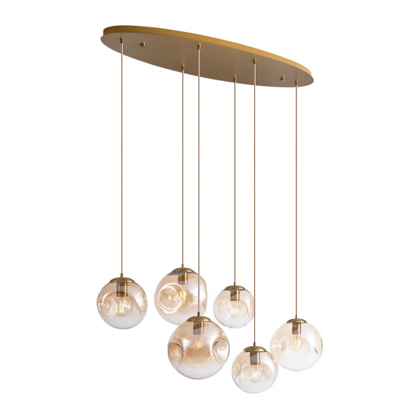 Art-Deco-Hängelampe Messing mit ovaler Deckenplatte und bernsteinfarbenem Glas 6-flammig - Douglass