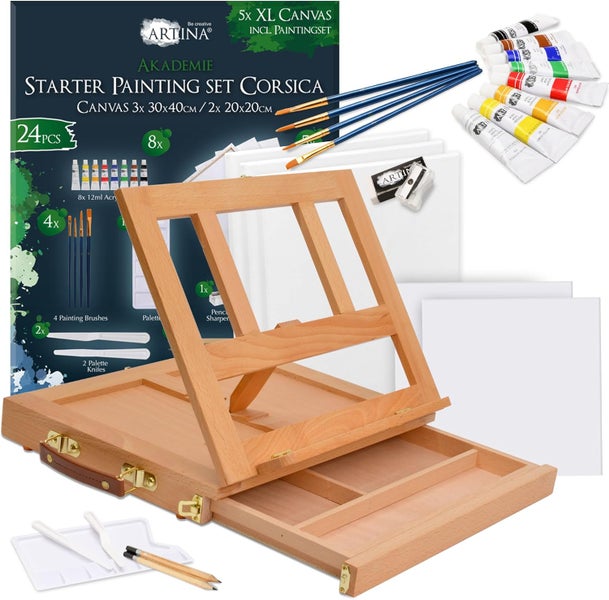- HinweisEntdecken Sie mit dem umfangreichen 25-teiligen Artina Malset Ihr persönliches Malerlebnis mit 1x Staffelei, 5x Leinwänden, 8x verschiedene Acryl Farben, 4x Malpinseln, 2x Malspachtel/Malmesser, 1x Malpalette, 2x Zeichenstifte sowie 1x Radierer und 1x Spitzer. Neben fünf Keilrahmen erhalten Sie 8 verschiedene Acryl Farben in 12ml Tuben und 4x Pinsel zum Malen. Zubehör wie Malspachtel und Malpalette ergänzen das Set und sind die besten Voraussetzungen beim Erschaffen von Kunst und natürlich darf es auch an Zeichenstiften und Zubehör nicht fehlen Set Produkte unserer Exklusivmarke Artina sind äußerst beliebt bei unseren Kunden und eine gern gewählte Marke für Acrylfarben, Keilrahmen, Zubehör und mehr. Sie umfasst zahlreiche Produkte für angehende Künstler und ambitionierte Hobby-Maler und ist aus vielen Ateliers und Studios kaum noch wegzudenken