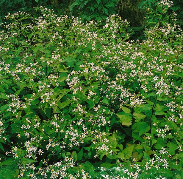 Aster divaricatus ‘Tradescant’, die Weiße Wald-Aster (Syn.: Eurybia divaricata), ist eine elegante Schattenstaude, die mit filigranen, sternförmigen Blüten und dunklen, kontrastierenden Stielen Akzente setzt. Von August bis Oktober schmückt der robuste Blütenstauden-Klassiker halbschattige bis schattige Bereiche mit einer Fülle kleiner weißer Körbchenblüten, deren Mitte von warmem Gelb zu zartem Rosa überhaucht sein kann. Das herzförmige, frischgrüne Laub bildet einen lockeren, horstigen Teppich, der sich leicht ausbreitet, ohne aufdringlich zu werden, und damit ideal für den Gehölzrand, den schattigen Beetbereich und den Vorgarten ist. Als Gartenstaude bringt sie Struktur und Leichtigkeit in naturnahe Pflanzungen, wirkt als Solitär ebenso anmutig wie in Gruppenpflanzungen und eignet sich auf größeren Terrassen auch als dezente Kübelpflanze im Halbschatten. Der Wuchs ist locker aufrecht, verzweigt und standfest, wodurch sich die Wald-Aster hervorragend mit Farnen, Hosta, Carex und anderen Schattenliebhabern kombinieren lässt. Sie bevorzugt humose, gut durchlässige, frische bis mäßig trockene Böden und zeigt sich erstaunlich anpassungsfähig, wenn der Standort gleichmäßig mulchgedeckt bleibt. Ein Rückschnitt der Stängel im späten Winter fördert den kompakten Austrieb, während eine dezente Nährstoffgabe im Frühjahr die Blühfreude unterstützt. Aster divaricatus ‘Tradescant’ überzeugt als pflegeleichter Blütenstrauch-Charakter im Staudenbeet, der schattige Gartensituationen aufhellt und als langlebige Zierstaude das ganze Jahr über einen natürlichen, eleganten Eindruck hinterlässt.