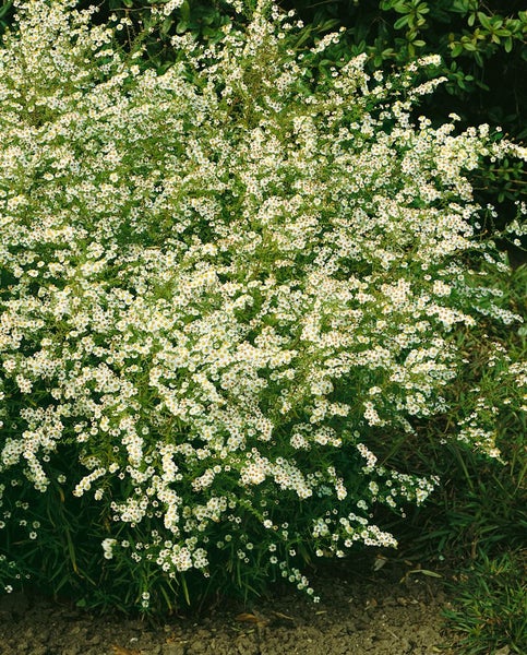 Aster ericoides ‘Golden Spray’, die zierliche Heide-Aster, präsentiert sich als elegante Herbstaster mit unzähligen sternförmigen Blüten und feinem, heideähnlichem Laub. Die reichblühende Staude öffnet von September bis in den Oktober hinein eine Fülle kleiner Körbchenblüten, deren Knospen warm gelblich anmuten und zu cremeweißen bis elfenbeinfarbenen Strahlenblüten mit goldgelber Mitte erhellen. Der locker aufrechte, buschige Wuchs mit vielen verzweigten, standfesten Trieben bildet einen leichten, wolkigen Effekt, der Beeten und Rabatten luftige Struktur verleiht. Das schmal-nadelige, dunkelgrüne Laub bleibt bis spät in die Saison attraktiv und setzt die Blütenwolken wirkungsvoll in Szene.