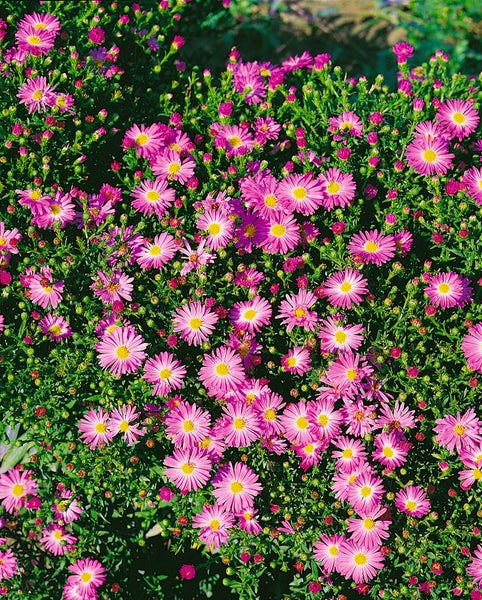 Aster novi-belgii ‘Rosenhügel’, die Glattblatt-Aster bzw. Herbst-Aster, überzeugt als leuchtende Beetstaude mit einem üppigen Schleier aus rosafarbenen Blüten, die je nach Witterung von Spätsommer bis in den Herbst hinein erscheinen und Beete sowie Rabatten zuverlässig aufhellen. Die zahlreichen, halbgefüllten bis einfachen Körbchenblüten mit gelber Mitte sitzen dicht an aufrechten, gut verzweigten Stielen über frischgrünem, lanzettlichem Laub und bilden einen kompakten, horstigen Wuchs, der sowohl in der Gruppenpflanzung als auch als Solitär im Vorgarten eine harmonische Figur macht. Als klassische Gartenstaude passt ‘Rosenhügel’ hervorragend in Staudenbeete, den Bauerngarten und gemischte Zierpflanzungen, lässt sich aber ebenso als dekorative Kübelpflanze auf Terrasse und Balkon kultivieren, wo sie mit ihrer späten Blütezeit attraktive Farbakzente setzt und als Schnittblume in herbstlichen Sträußen punktet. Am besten gedeiht dieser pflegeleichte Blütenstaudenschatz an einem sonnigen bis licht halbschattigen Standort in humosem, nährstoffreichem, gleichmäßig frischem und gut drainiertem Boden; kurze Trockenphasen werden toleriert, dennoch fördert regelmäßiges Gießen in heißen Perioden die Blühfreude. Eine dünne Mulchschicht hält die Feuchtigkeit, während eine maßvolle Frühjahrsdüngung das Wachstum unterstützt. Für eine kompakte, standfeste Erscheinung empfiehlt sich ein Rückschnitt der Triebe nach der Blüte oder erst im zeitigen Frühjahr sowie eine Teilung des Horstes alle paar Jahre zur Verjüngung. Mit ihrer eleganten, buschigen Wuchsform und den zart rosigen Blüten ist Aster novi-belgii ‘Rosenhügel’ eine vielseitige Zierstaude, die späte Saisonlücken schließt und in Beeträndern, vor Gehölzen und entlang von Wegen langlebige, farbstarke Strukturen schafft.