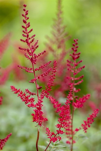 Astilbe japonica ‘Montgomery’, die Japanische Prachtspiere, ist eine elegante Gartenstaude mit eindrucksvollen, tief karminroten Blütenrispen, die in dichten, gefiederten Wolken von Juni bis August über dem Laub schweben. Ihr horstbildender, aufrechter Wuchs wirkt harmonisch und strukturiert, während das fein gefiederte, im Austrieb bronzeschimmernde und später sattgrüne Laub einen attraktiven Kontrast zu den dunklen Rispen bildet. Als Schattenstaude und Beetstaude fühlt sich diese Astilbe besonders in halbschattigen bis schattigen Lagen wohl und bringt lebendige Farbe an Gehölzränder, in den Vorgarten, an den Teich- oder Bachrand sowie in gemischte Staudenbeete. Sie eignet sich sowohl für Gruppenpflanzungen, die eindrucksvolle, gleichmäßige Farbfelder schaffen, als auch als Solitärakzent in Rabatten oder als wirkungsvolle Kübelpflanze auf der Terrasse, sofern der Wurzelbereich konstant frisch bis feucht gehalten wird.