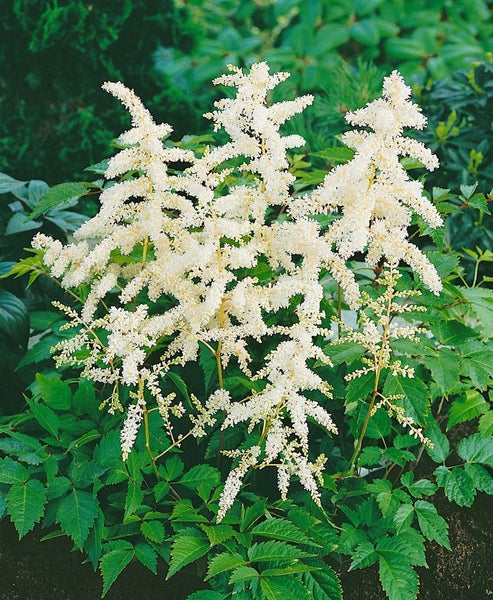 Astilbe japonica ‘Washington’, die Japanische Prachtspiere, ist eine elegante Gartenstaude mit klassischem Charme, die als Beetstaude im Halbschatten überzeugt. Ihre aufrecht getragenen, reinweißen Blütenrispen erscheinen von Juni bis Juli und schweben wie lichtvolle Federn über dichtem, frischgrünem, fein gefiedertem Laub. Der horstbildende Wuchs bleibt formschön und kompakt, wodurch sich diese Staude sowohl für Rabatten und den Vorder- bis Mittelgrund im Staudenbeet als auch für naturnahe Pflanzungen am Gehölzrand eignet. Als Solitär setzt sie helle Akzente, in der Gruppenpflanzung entsteht ein harmonischer Teppich mit gleichmäßiger Blütenschau. Auch als Kübelpflanze auf schattigen Terrassen macht die Prachtspiere eine gute Figur, sofern eine konstant gleichmäßige Feuchte gewährleistet ist.