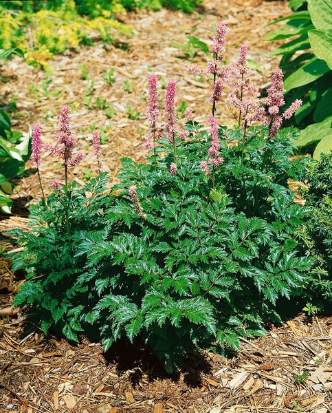 Astilbe x crispa ‘Perkeo’ bevorzugt halbschattige bis schattige Standorte, wo der Boden gleichmäßig frisch bis feucht, humos und nährstoffreich ist. Auf leichten, schwach sauren bis neutralen Substraten entwickelt sie ihre Farbe und Blattstruktur besonders gut; Staunässe und sommerliche Trockenheit sollten vermieden werden. Eine Mulchschicht hält die Feuchtigkeit, und eine Gabe Kompost im Frühjahr fördert die Blühfreude. Nach der Blüte können die Rispen bodennah zurückgeschnitten werden; alternativ sorgen sie getrocknet für zarte Strukturen im Spätsommer. In Kombination mit Farnen, Hosta, Heuchera oder anderen Schattenstauden entsteht ein stimmiges Bild, das Beete am Teichrand, im Naturgarten oder unter lichten Gehölzen dauerhaft aufwertet. Robust, langlebig und formschön setzt ‘Perkeo’ zuverlässige Farbakzente auf kleiner Fläche.
