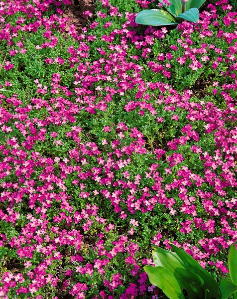 Aubrieta x cultorum ‘Rosenteppich’, das beliebte Blaukissen, ist eine klassische Polsterstaude, die im Frühling leuchtend rosafarbene Blüten zu einem dichten, teppichartigen Flor vereint. Der kompakte, kriechende Wuchs bildet rasch niedrige Polster, die Mauerkronen, Beetränder und Fugen elegant überhängen. Von April bis Mai erscheinen unzählige, vierblättrige Blüten über dem feinen, grau- bis blaugrünen, wintergrünen Laub, das als attraktiver Blattteppich ganzjährig Struktur gibt. Diese Blütenstaude eignet sich ideal als Bodendecker im Steingarten, für Trockenmauern, als Einfassung im Vorgarten, für Beete und Rabatten sowie für Pflanzschalen und Kübel auf Terrasse und Balkon; in Gruppenpflanzung entsteht ein geschlossener Farbteppich, während einzelne Polster auch als kleiner Solitär am Wegrand Akzente setzen.