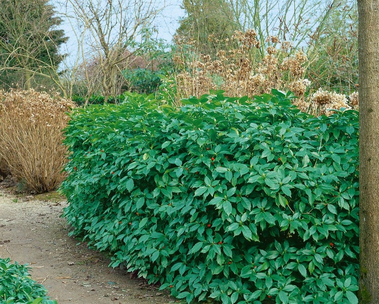 Als vielseitige Kübelpflanze für Terrasse und Eingangsbereich, als eleganter Solitär im Vorgarten oder in Gruppenpflanzung im halbschattigen Beet setzt ‘Rozannie’ wirkungsvolle Akzente. Auch als niedrige, immergrüne Heckenpflanze oder Unterpflanzung unter lichten Gehölzen macht sie eine hervorragende Figur, vor allem dort, wo andere Blütensträucher wegen Schatten schwächeln. Bevorzugt werden schattige bis halbschattige Standorte, geschützt vor praller Mittagssonne und kalten Ostwinden. Der Boden sollte humos, locker und gleichmäßig frisch bis mäßig trocken sein; kurze Trockenphasen werden nach der Etablierung gut toleriert, Staunässe ist zu vermeiden. Ein Rückschnitt ist kaum nötig, kann aber nach der Fruchtphase oder im zeitigen Frühjahr zur Formkorrektur erfolgen. Eine dünne Mulchschicht hält die Feuchtigkeit, und eine moderate Frühjahrsdüngung fördert den dichten Neuaustrieb. So bleibt Aucuba japonica ‘Rozannie’ als pflegeleichter Blüten- und Blattschmuckstrauch ganzjährig ein zuverlässiger Blickfang.