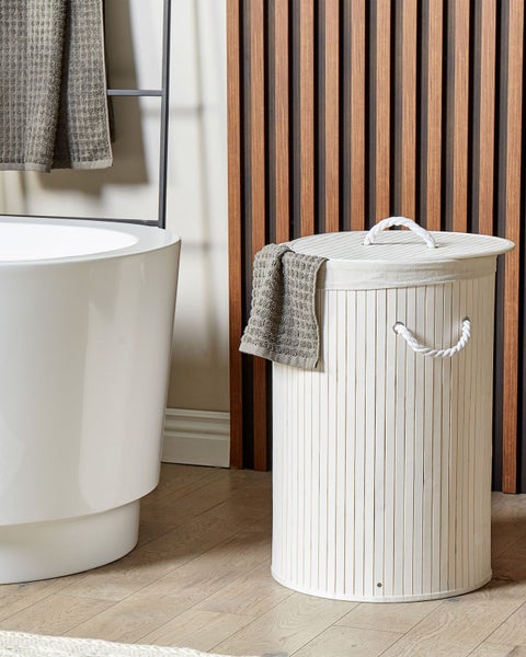 Runder, handgefertigter Wäschekorb mit Deckel und Wäschesack. Dieser stilvolle, handgefertigte Korb bietet Platz für Ihre Wäsche oder andere Gegenstände. Außen aus Bambusholz und innen aus hochwertigem Polyester gefertigt, ist das Stück sehr langlebig und pflegeleicht. Der Korb verfügt über einen abnehmbaren Deckel und Griffe, mit denen Sie ihn leicht bewegen können. Wird der Korb nicht gebraucht, lässt er sich zusammenklappen und verstauen. Details: Typ Wäschekörbe. Farbe: Weiß. Material: Holz. Material: Bambusholz. Zusätzliches Material: Stoff. Zusammenstellung: 60% Polyester. Form: Rund. Finish: Farbig. Handgefertigt: Ja. Volumen: 75. Abmessungen: Tiefe: 40 cm. Breite: 40 cm. Höhe: 60 cm. Gewicht: 2 kg. .Sie kaufen: 1 x Korb. Produktvorteile: Erzeugt Wohlfühlcharakter in jedem Raum, Dekorativ und zugleich funktional, Handgefertigte Präzision, Hochwertiges Material, Vielseitige Nutzungsmöglichkeiten, Grosszügiger Stauraum. Montage: Teilweise montiert.5 - 15 Min. Zusatzinformationen: Bitte beachten Sie, dass jedes Produkt handgefertigt ist. Abweichungen in Struktur, Farbe oder Form können aufgrund der Eigenschaften der verwendeten Materialien auftreten und stellen keinen Qualitätsmangel dar. Da bei der Herstellung natürliche Materialien verwendet werden, können kleine Farb-, Form-, bzw. Größendifferenzen auftreten. Diese Unterschiede stellen jedoch keinen Produktfehler dar. Pflegeanleitung: Bambusholz: 1.Bitte ausschließlich milde Reinigungsmittel und weiche Tüchern verwenden. Dabei immer in Richtung der Maserung abwischen. 2.Sofort nach der Reinigung abtrocknen, um zu verhindern, dass sich Wasser auf dem Produkt absetzt. 3.Nur bei geölten Holzartikeln befolgen: Sie sollten nach einiger Zeit nachgeölt werden, damit sie lange in einem guten Zustand erhalten bleiben. Stoff: 1.Von Hand oder mit einem Feinwäsche-Programm bei max. 30°C waschen, wenn auf dem Etikett keine weiteren Hinweise des Herstellers gegeben sind. 2.Wenn auf dem Etikett nicht anders angegeben, bitte nicht im Trockner trocknen und auch nicht bügeln.