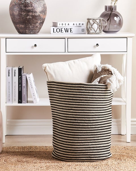 Grosser Boho Korb mit gestreiftem Muster. Mit diesem vielseitigen, dekorativen Korb lässt sich jeder Raum auffrischen und mühelos aufräumen. Aus weicher, aber strapazierfähiger Baumwolle von höchster Qualität gefertigt, ist er der ideale Korb für die Wäsche im Badezimmer oder für das Kinderzimmer, um Spielsachen im Handumdrehen zu sammeln. Mit seinem originellen Streifenmuster passt der Korb zu einer Vielzahl von Einrichtungsstilen. Details: Typ Korb. Farbe: Beige. Material: Stoff. Material: Baumwolle. Zusammenstellung: 100% Baumwolle. Form: Rund. Handgefertigt: Ja. Abmessungen: Tiefe: 41 cm. Breite: 41 cm. Höhe: 51 cm. Gewicht: 1 kg. .Sie kaufen: 1 x Korb. Produktvorteile: Erzeugt Wohlfühlcharakter in jedem Raum, Dekorativ und zugleich funktional, Besonders pflegeleicht und langlebig, Handgefertigte Präzision, Vielseitige Nutzungsmöglichkeiten, Grosszügiger Stauraum, In der Waschmaschine als Ganzes waschbar. Montage: Benötigt keine Montage. Zusatzinformationen: Der Artikel wird erst nach einiger Zeit seine gewünschte Form annehmen. Daher empfiehlt es sich, ihn so bald wie möglich auszupacken und mindestens 48 Stunden zu warten. Um eine bessere Wirkung zu erzielen, sollte er mit größeren Gegenständen ausgefüllt werden. Pflegeanleitung: Baumwolle: 1.Von Hand oder mit einem Feinwäsche-Programm bei max. 30°C waschen, wenn auf dem Etikett keine weiteren Hinweise des Herstellers gegeben sind. 2.Wenn auf dem Etikett nicht anders angegeben, bitte nicht im Trockner trocknen und auch nicht bügeln.