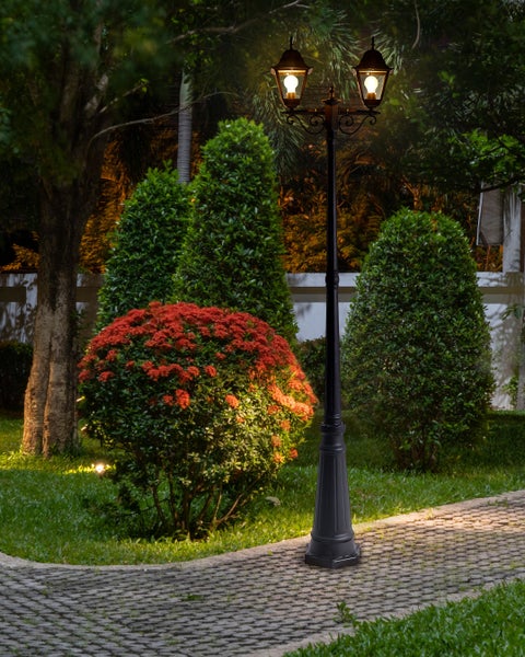 Mastleuchte für den Garten. Verwandeln Sie Ihren Außenbereich mit dieser eleganten 2-flammigen Laterne, die durch ihr charmantes Vintage-Design eine zeitlose Eleganz ausstrahlt. Gefertigt aus langlebigem Aluminium und Glas, verbindet diese Lampe klassische Ästhetik mit moderner Robustheit. Die wasserdichte Konstruktion garantiert eine zuverlässige Beleuchtung bei jedem Wetter und macht sie ideal für Gärten, Terrassen und Wege. Mit ihrer stilvollen Form und dem warmen Licht dient diese Mastleuchte nicht nur als Lichtquelle, sondern auch als eindrucksvolles Dekoelement für jeden Outdoorbereich. Details: Typ Außenlaterne. Farbe: Schwarz. Material: Metall. Material: Aluminium. Zusätzliches Material: Glas. Material Lampenfuss: Metall. Material Lampenschirm: Glas. Fassung: Max. 60 W. Finish: Gefärbt. Schutzklasse: IP 44 (spritzwassergeschützt). Anzahl der Glühbirnen: 2. Spannung 220-240 V (50 Hz). Abmessungen: Fuß: 26x26. Tiefe: 26 cm. Breite: 55 cm. Höhe: 222 cm. Gewicht: 6 kg. .Sie kaufen: 1 x Außenlaterne, Nicht im Lieferumfang enthalten: Leuchtmittel. Produktvorteile: Moderne Terrassen- und Gartenmöbel, Dekorativ und zugleich funktional, Geschützt gegen harte Fremdkörper über 1 mm und Spritzwasser mit geringer Geschwindigkeit (IP 44), Speziell für die Nutzung im Außenbereich entworfen, Pflegeleichtes und strapazierfähiges Material. Montage: Erfordert Installation und Montage.20 - 40 Min. Zusatzinformationen: Die Installation ist vom Elektroinstallateur auszuführen. Das Produkt ist auf einem festen Untergrund zu montieren. Bei Gras- oder Kiesböden muss ein Loch ausgehoben und mit Beton oder einem geeigneten Fundament gefüllt werden, um eine sichere Montage zu gewährleisten. Pflegeanleitung: 1.Die Reinigung kann mit handelsüblicher milder Seifenlauge erfolgen, bitte dabei ausschließlich milde Reinigungsmittel verwenden. 2.Wir empfehlen für die Wintersaison eine Schutzhülle zu verwenden oder, wenn möglich, die Möbel trocken und kühl drinnen zu lagern. Glas: 1.Bitte ausschließlich milde Reinigungsmittel bzw. Glasreiniger und weiche Tücher verwenden. Feuchte Stellen mit einem weichen Tuch trocken reiben. 2.Keine scheuernden Reinigungsmittel nutzen, da diese die Oberfläche beschädigen können. 3.Die Glasflächen sollten nach Regen/Schnee trocken gewischt werden. Zusätzlich empfehlen wir für die Wintersaison Schutzabdeckungen zu verwenden oder, wenn möglich, die Möbel trocken und kühl drinnen zu lagern. 4.Verfügt Ihr Artikel über einen Crashglas-Effekt, sollte dieser unbedingt an einem feuchtigkeitsgeschützten Ort aufbewahrt werden.