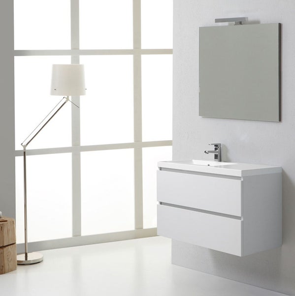 Badezimmermöbel – Set mit 2 Schubladen, Waschbecken links, Spiegel 90x70 und LED-Lampe | Manhattan