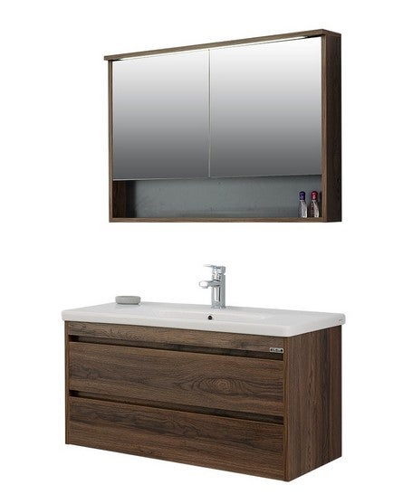 Kreasoft 100cm cm Kreabad Badmöbel Set – Braun Badezimmermöbel ist ein 2-teiliges Badezimmerset. Dieses Set besteht aus einem Keramik Waschbecken, einem Waschbeckenunterschrank und mit einem Spiegelschrank mit LED Beleuchtung. Der Waschbeckenunterschrank ist mit 2 soft-close Schubladen Farbe (wie abgebildet): Braun. Die Möbel dieses Sets werden vormontiert geliefert. Das Waschbecken ist aus keramik hergestellt. Der Waschbeckenunterschrank und Spiegelschrank sind aus hochwertigem MDF hergestellt.