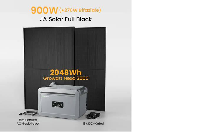 Balkonkraftwerk-Set: Growatt NEXA 2000 All-in-One Speicher, JaSolar Module Full Black Bifaciale (900)
