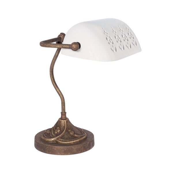 Bankerlampe Weiß Bronze Antik 29,5 cm hoch klein Glas Echt-Messing E27 Jugendstil Tischleuchte Schreibtisch