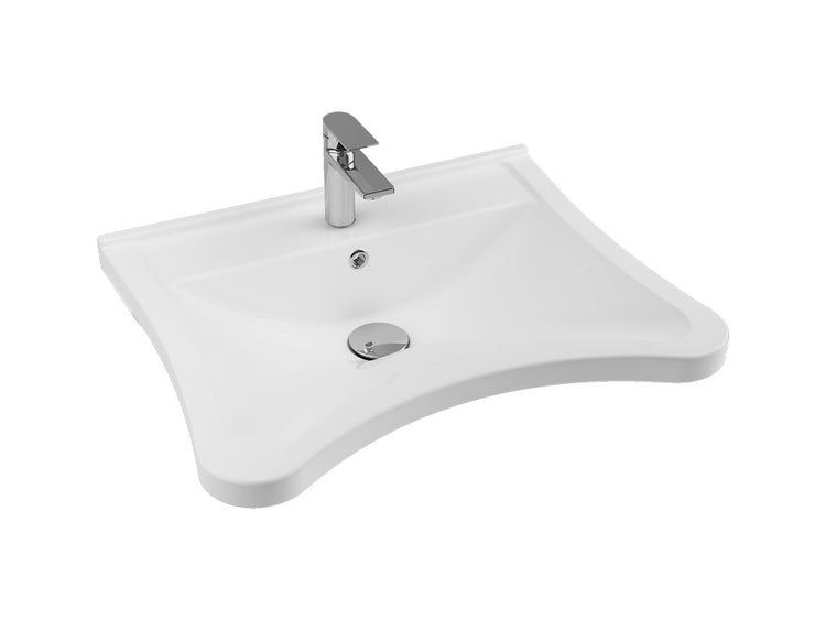 Die Ränder des Waschbeckens gehen in eine breite Hahnlochbank mit Hahnloch über, die Platz für Seifenspender oder Deko lassen. Das großzügige Innenbecken bietet weiteren Komfort beim Waschen und viel Freiraum. Durch die Sanitärkeramik ist die Oberfläche robust, aber gleichzeitig glänzend und elegant.