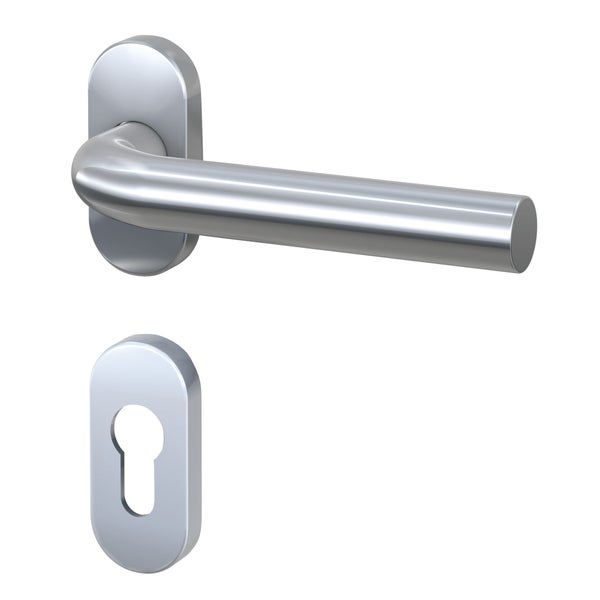 Zeitloses Design und hochwertige Ausführung in Edelstahl. Die halbe Schmalrahmen-Garnitur aus Edelstahl besteht aus der Türklinke in L-Form und der mitgelieferten Rosette. Die Rosette ist mit Lochung für Profilzylinder vorgefertigt. Die Drücker sind in zeitgemäßer L-Form, die Rosetten in ovaler Form. Der Beschlag eignet sich ideal für Profil- und Rahmentüren aus Kunststoff oder Metall. Mit Rückholfedermechanismus & nicht sichtbarer Verschraubung.