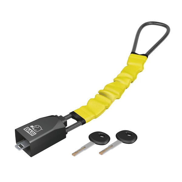 BASI Sicherheitsgurtschloss-/ Lenkradsperre KFZ 117 Universelle Diebstahlsicherung für PKW, LKW, SUVs usw. gelbe Nylonummantelung, inkl. 2 Schlüsseln