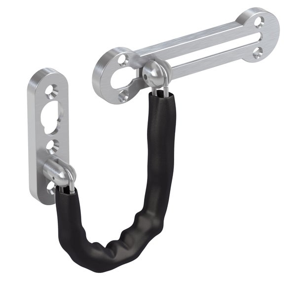 Türkette als Zusatzsicherung an Ihrer Haustüre / Wohnungstüre. Die Türkette zeichnet sich durch eine einfach Montage aus. Zudem gibt Sie Ihnen eine erhöhte Sicherheit in den eigenen 4 Wänden. Die Kettenglieder bestehen aus gehärteten Metall und sind mit einem Nylon Überzug ummantelt. Die Kettenlänge beträgt 185 mm.